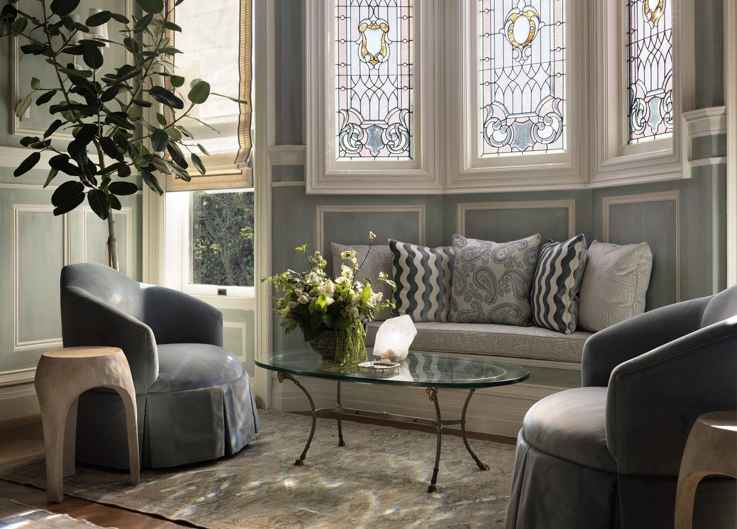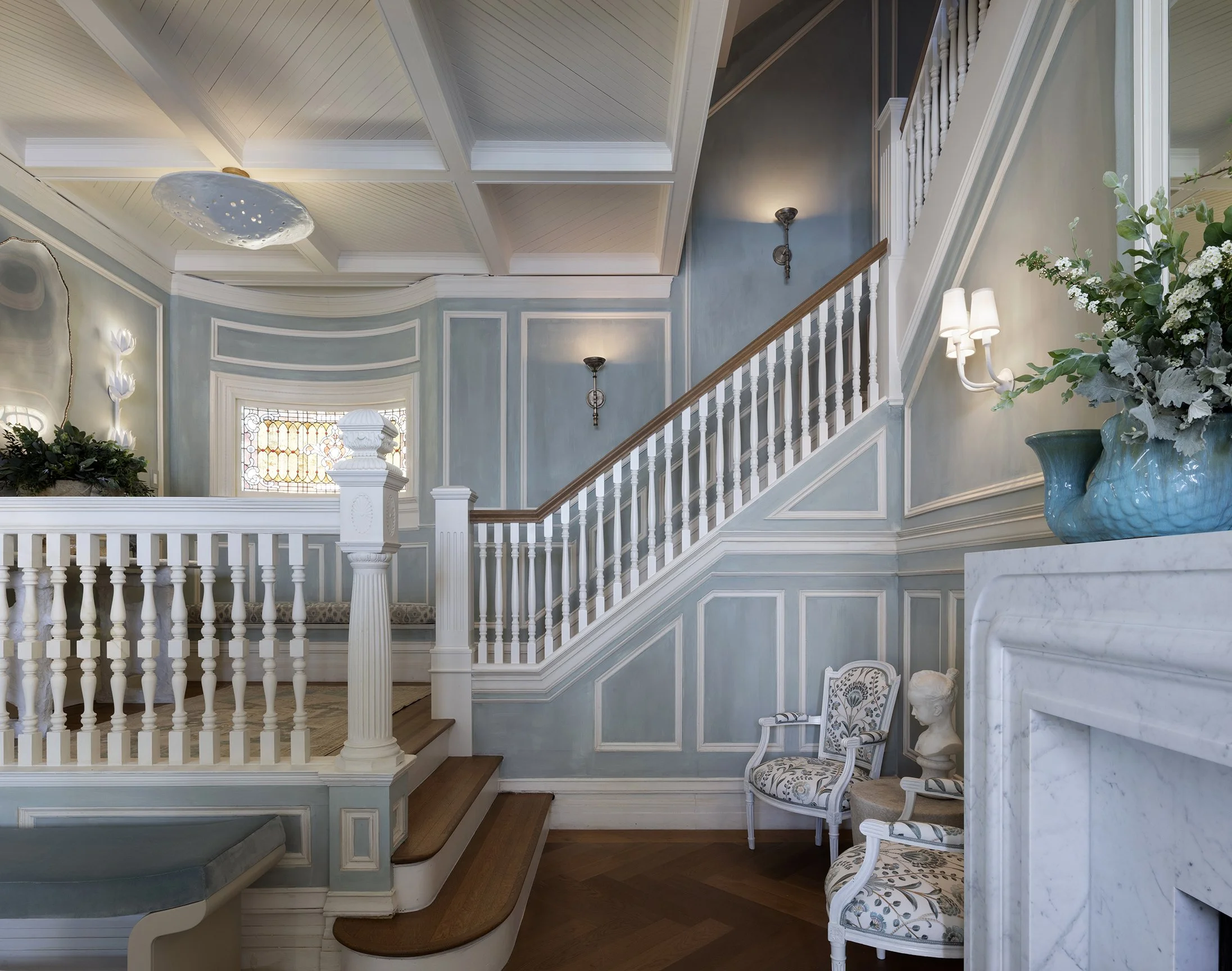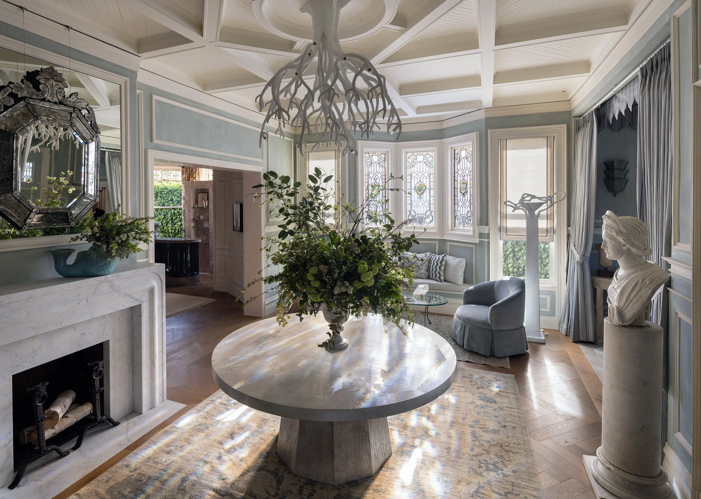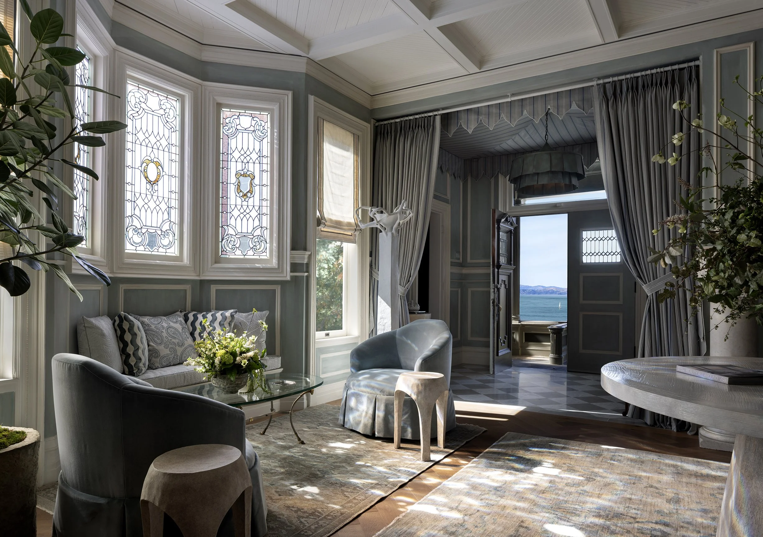 The Arrival sets the tone for the home, offering a first glimpse into the sensibility and experiences that unfold beyond the threshold. Conceived as a sequence rather than a single moment, the entry reflects how historic San Francisco houses were traditionally experienced, moving from intimacy at the entry into a more open and expansive interior. A tented entry creates a quiet pause before the space opens into a coffered hall, establishing a feeling of anticipation and welcome from the outset.