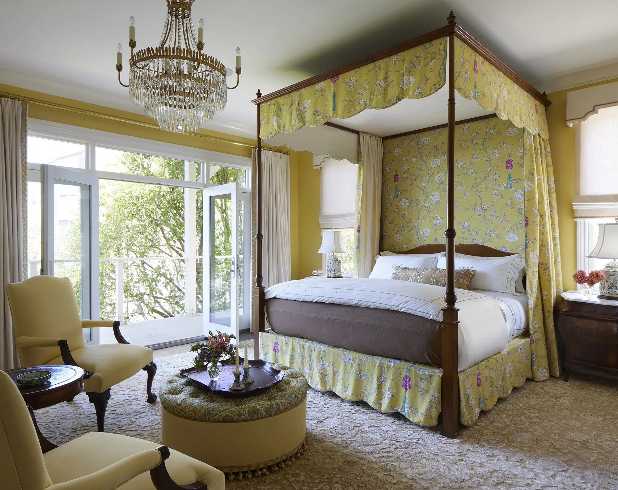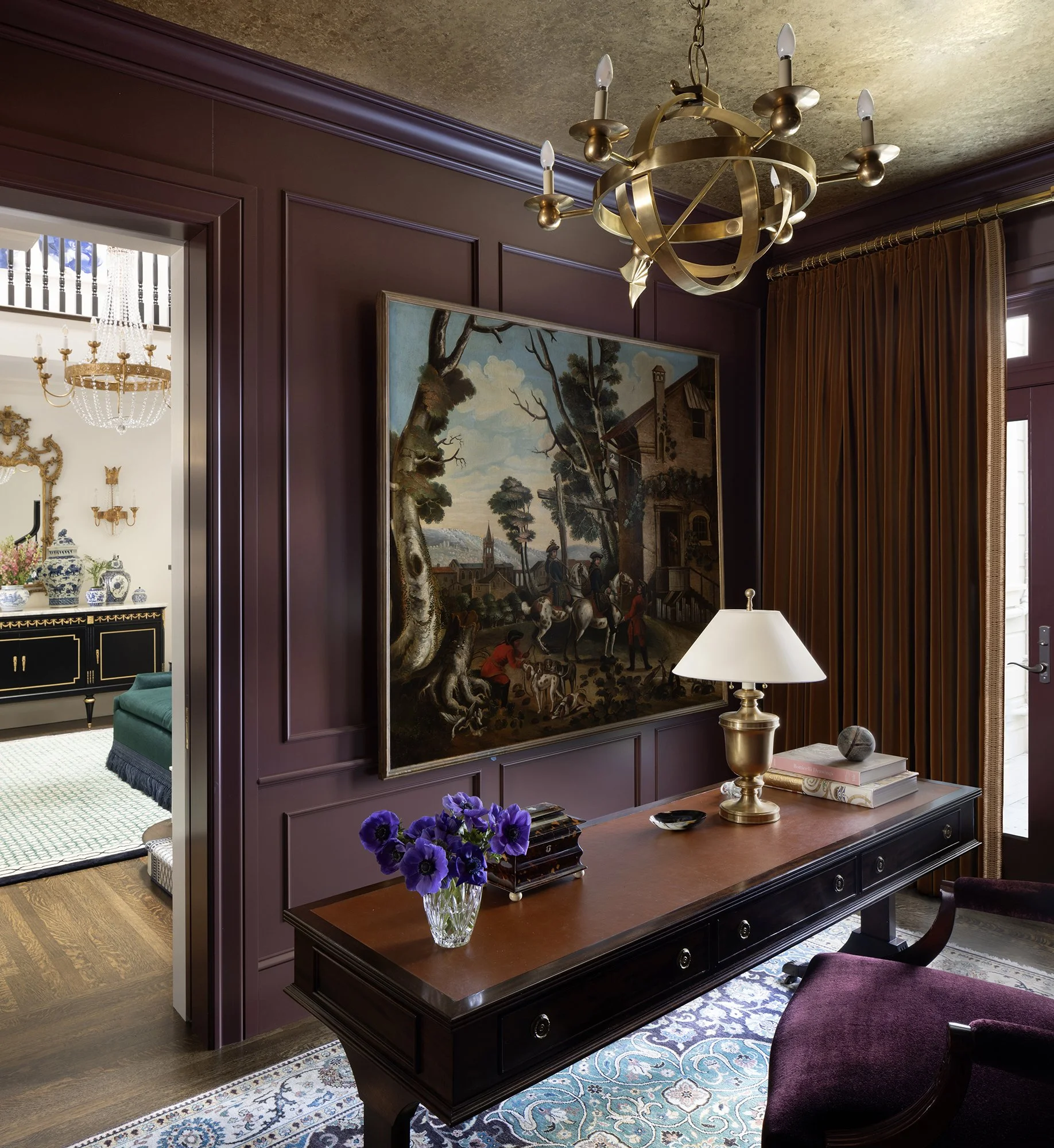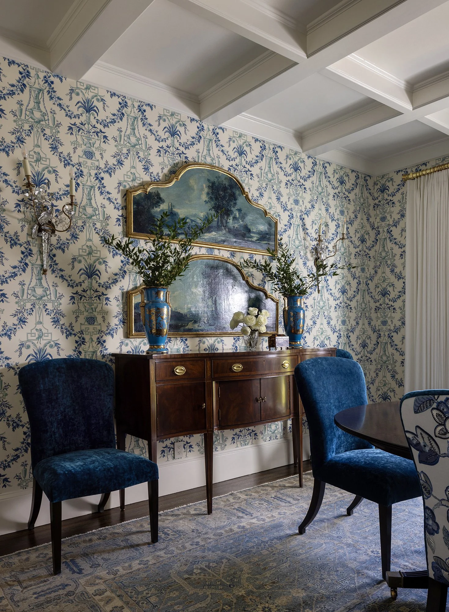 When our clients moved into their historic home, they wanted a formality that honored the home’s pedigree. Built in 1905, the bones were classic. Original woodwork remains, and sophisticated detailing creates a timeless backdrop: think architectural features such as coffered ceilings and custom moldings, crystal light fixtures that lend sparkling elegance, gilded mirrors, marble surfaces, and a staircase that goes on for days. From the lacquered blue kitchen to the living room enveloped in peacock blue and botanicals, to the blue-and-white dining room, teal bathroom, a handsome olive green study, and sunny yellow bedrooms, there is a color and pattern intensity throughout that still shows restraint. Meantime, fashion-forward materials like velvet, mohair, alpaca and bouillon fringe soften the seriousness and keep the formal furnishings comfortable and inviting.